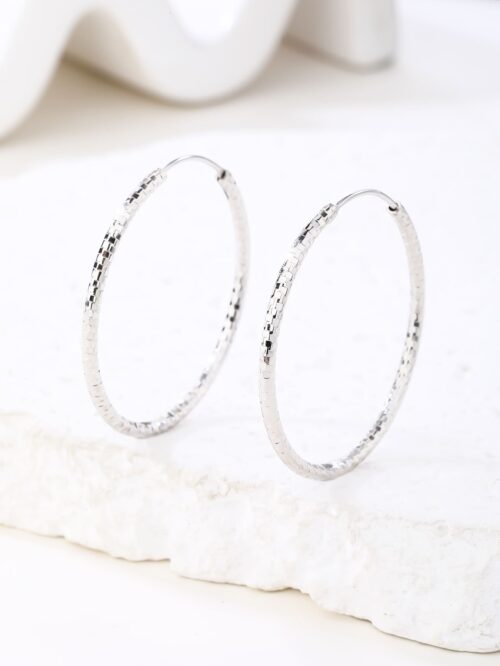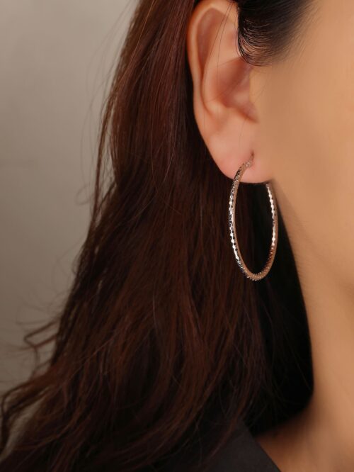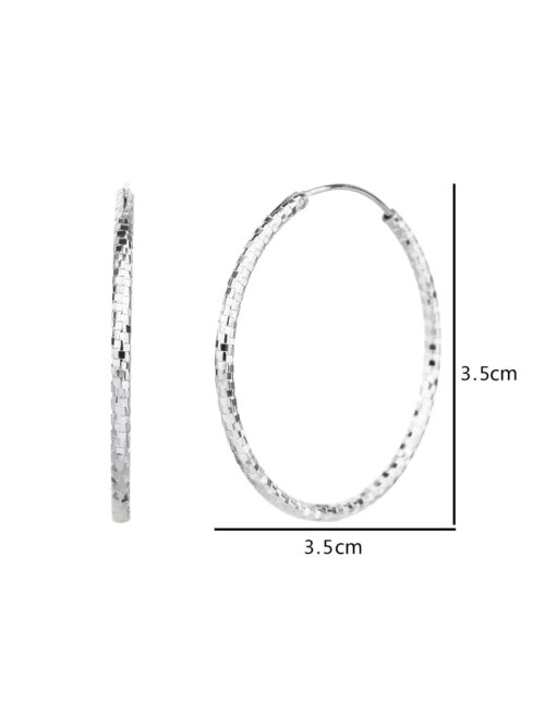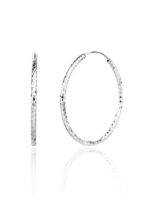 Ez a gyönyörű karika fülbevaló a klasszikus forma és a különleges felületkezelés tökéletes ötvözete. A gyémánt vésett minta finoman töri meg a fényt, így a fülbevaló minden szögből szikrázóan ragyog. A 3,5 cm átmérő ideális méret a kifinomult, mégis feltűnő megjelenéshez.