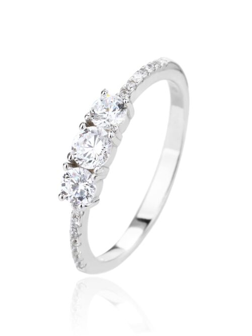 Ezüst eljegyzési gyűrű három központi és apró cirkónia kövekkel – a szerelem örök jelképe