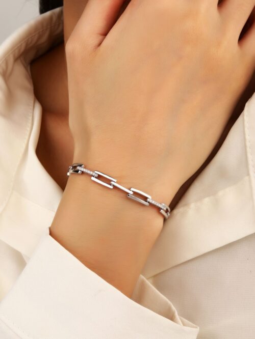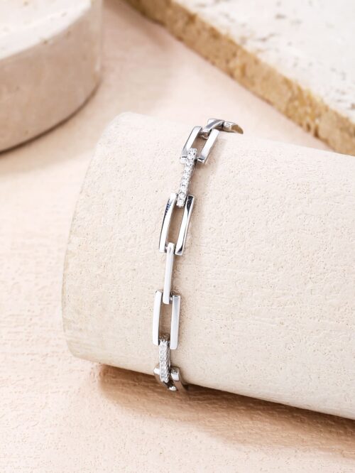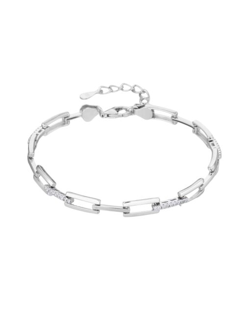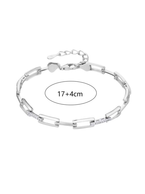 Ez a 17+4 cm hosszúságú karkötő AG 925 ezüstből készült, ródium bevonattal, amely fényét hosszú időn át megőrzi. A különleges, téglalap alakú láncszemeket apró, ragyogó cirkónia kövek díszítik, amelyek játékosan tükrözik vissza a fényt. Az állítható méretnek köszönhetően kényelmesen illeszkedik minden csuklóra.
