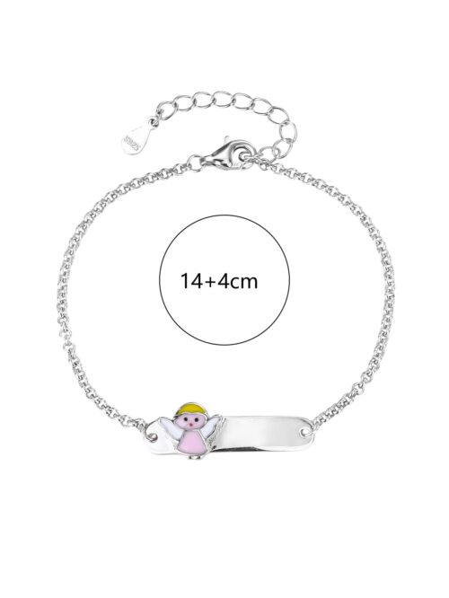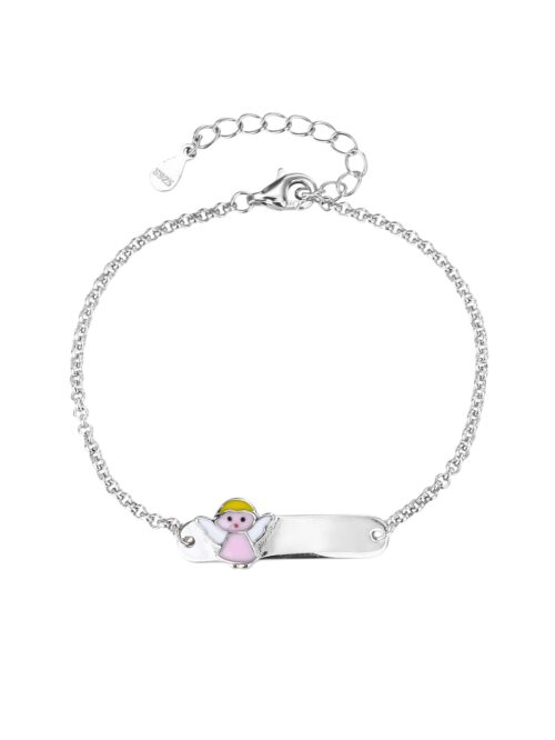 A rózsaszín és fehér zománcozott angyalka motívum a tisztaságot, védelmet és szeretetet szimbolizálja – ideális választás kisgyermekeknek.