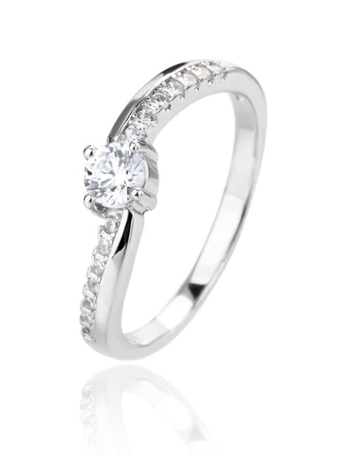 Középen egy briliáns csiszolású fehér cirkónia kő tündököl, amelyet a gyűrű szárán sorakozó apróbb kövek még jobban kiemelnek.